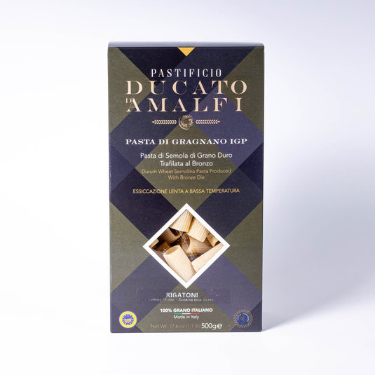 De rigatoni van Pastificio Ducato d’Amalfi zijn een toonbeeld van authentiek Italiaans vakmanschap. Afkomstig uit het beroemde pastastadje Gragnano, nabij de Amalfikust, wordt deze pasta geproduceerd volgens eeuwenoude tradities die wereldwijd bekend staan om hun uitzonderlijke kwaliteit. Deze rigatoni dragen de prestigieuze Pasta di Gragnano IGP-status, een beschermde herkomstbenaming die garandeert dat de pasta volgens strikte traditionele methoden is vervaardigd.